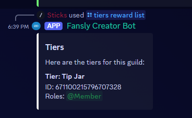 Because you've already imported your Fansly data, you will be ready to add tier rewards. To do this, run /tiers reward add <tier> <role>. This will set the role that is given to people who are subscribed to the tier on Fansly.
